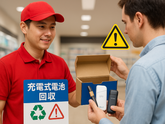電子タバコ本体(IQOS/glo/Ploom など)はリチウムイオン電池を内蔵しているため、燃えるごみ・不燃ごみには出せません。発火事故を防ぐため、店頭や専門回収へ安全に出しましょう。岩国市での適正処分は、株式会社アインが回収~適正処理までサポートします。